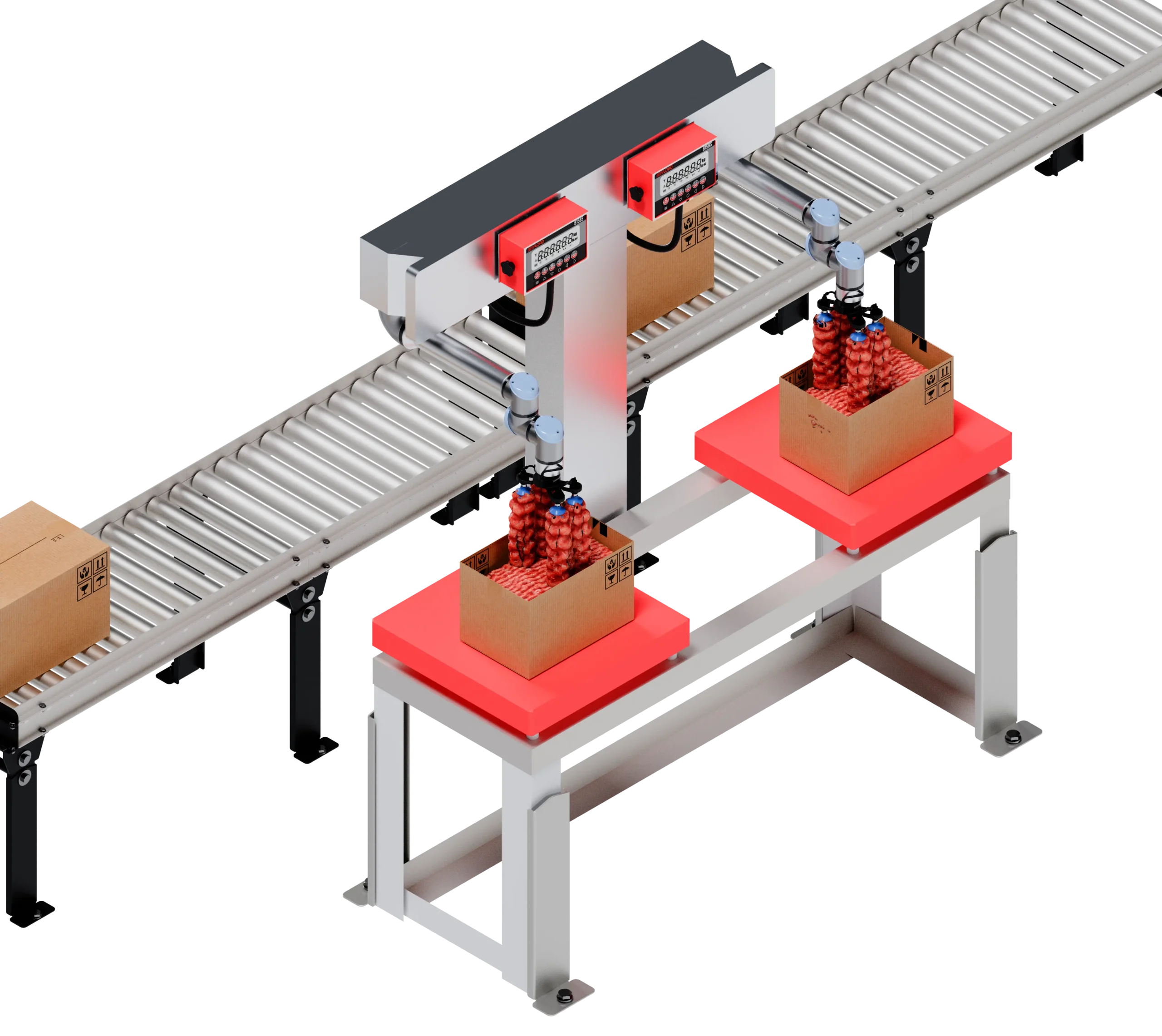在自动化肉类加工环境中,装箱工作站必须提供稳定精准的重量输出,以确保生产效率并满足法规符合性要求。为达成精确分装控制需求,本工作站集成 ANYLOAD TNS 不锈钢台秤作为全卫生级称重单元,在填充作业过程中提供实时反馈。