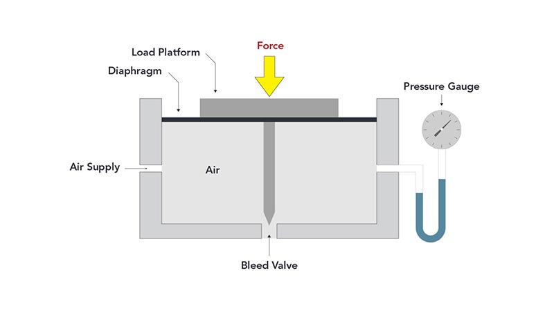 When a load is applied, it causes a deformation in a diaphragm within the pneumatic load cell. This deformation changes the volume inside the cell, which in turn affects the air pressure. The pressure is then stabilized to a set point by adding or releasing air. The amount of air pressure needed to achieve this balance is indicative of the force applied and is measured by a pressure sensor.