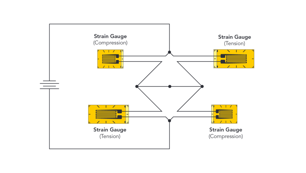 Output is maximized with four strain gauges, increasing the resolution of the load cell. If each strain gauge outputs 0.5mV/V, a bridge with only one strain gauge would have a variance range of 0.5mV/V. With four strain gauges, there is a variance range of 2.0mV/V. A larger sampling size allows for more accurate measurements to be derived.