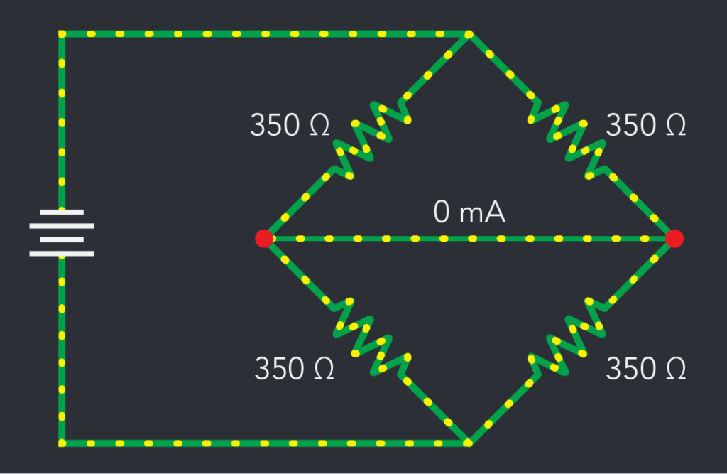 When the bridge circuit is balanced, with all resistors at the same electrical resistance, a baseline can be established. A balanced circuit with zero output detected by the ammeter indicates that there is no load being applied to the load cell.