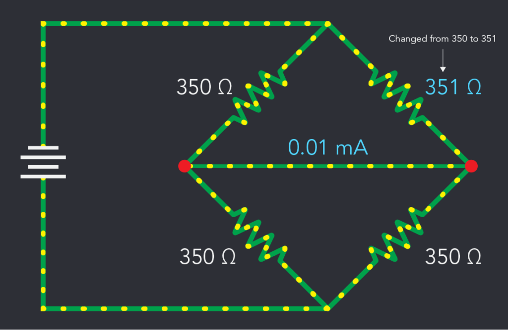 A change in resistance (Ω) in one of the resistors will result in a measurable current that flows through the ammeter.