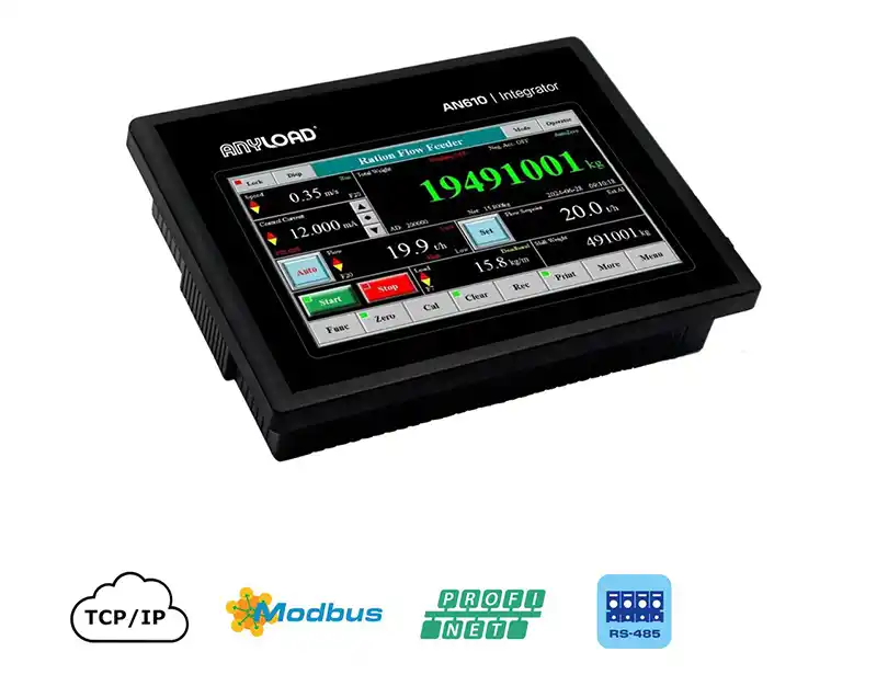 The Anyload AN610 Scale Integrator (Indicator) is a touchscreen-based weighing controller designed for conveyor belt scale systems and basic industrial flow measurement.