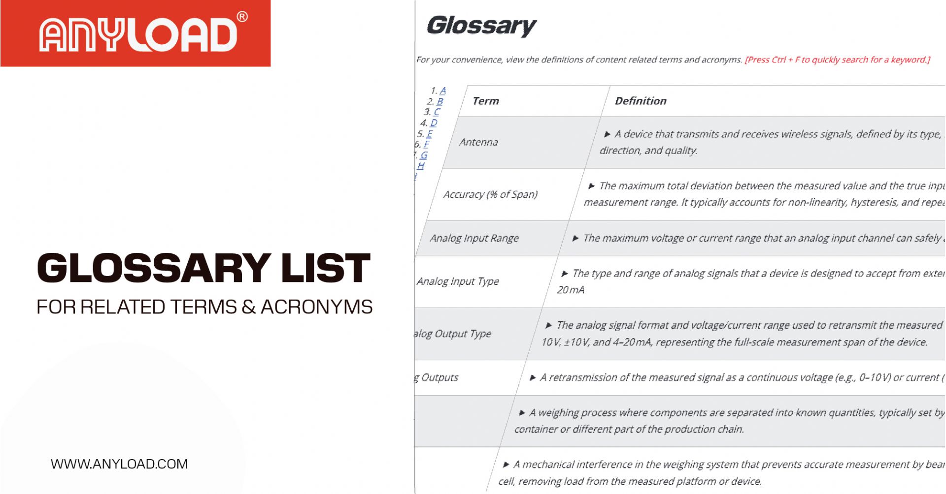ANYLOAD provides an alphabetically-organized list of key terms, acronyms and definitions related to weighing instruments, load cells, force measurement and related equipment. It serves as a quick reference for industry-specific language, helping users better understand technical specifications, applications and certification standards.